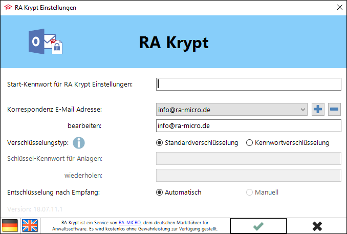 Nach Empfang einer Anlage von einem Krypt-Kontakt erfolgt die Entschlüsselung dann je nach Verschlüsselungstyp automatisch oder manuell über die Schaltfläche Entschlüsseln der RA‑MICRO Tools.